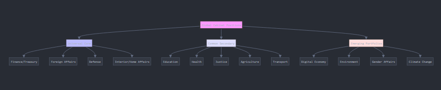 The study of cabinet structures reveals much about how nations perceive and organize their governmental responsibilities [1]. While core functions remain remarkably consistent across cultures and development levels, the variation in specialized portfolios provides insight into different approaches to governance and national priorities. Future research might productively explore how emerging challenges like artificial intelligence and climate change continue to reshape cabinet structures worldwide.