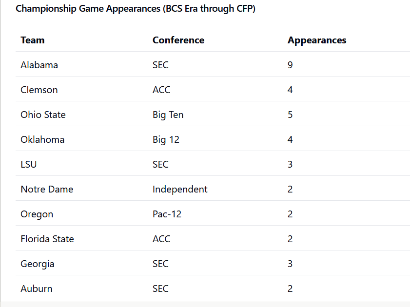 Analysis of championship participation data reveals significant disparities in conference representation. The SEC has dominated with 17 total appearances across the BCS and CFP eras, followed by the ACC with 6 appearances and the Big Ten with 5 appearances. Individual program success has been similarly concentrated, with Alabama making 9 appearances, Ohio State 5, and Clemson 4 since 1998.